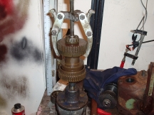 the rear flange nut and flange itself with the flywheel tool or puller the gear lever cotter pin which then allows the lever's actautor bearing to swing clear enough of the outputshaft as it comes out