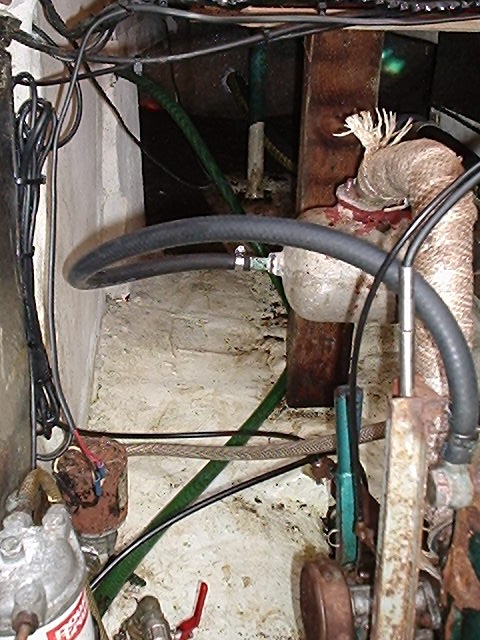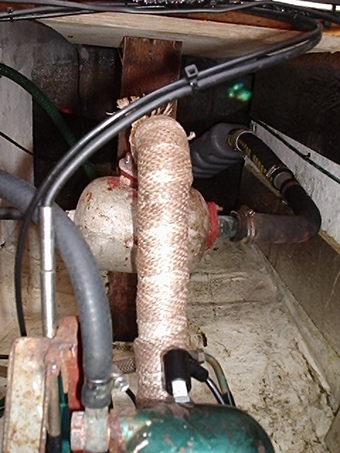 problem! Note i expressed concer about the lack of gooseneck height above w/l on this instalation to prevent syphoning/sinking, also the insecure muffler fittings were leaking water badly. Note here the jubilee clip